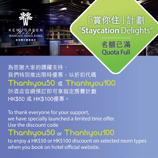 Use the discount code “Thankyou50" or “Thankyou100" to enjoy a HK$50 or HK$100 discount on selected room types when you book on the hotel's official website.